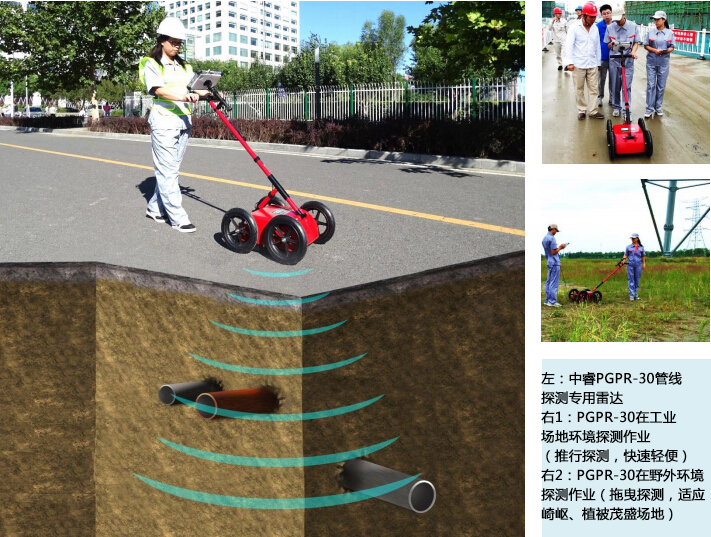 PGPR-30管線探測專用雷達是為精確探測和定位各類金屬、非金屬管線而設計的新型專用設備,由一體化主機、高性能屏蔽式天線、三防顯控終端和四輪(可切換兩輪)手推車等部件組成,便于攜帶作業、操作簡單、探測結果易于識別判讀,是目前性能先進、使用方便的國產管線探測雷達。可廣泛應用于管線普查和詳查、工程管線定位、環保監督等各個領域。